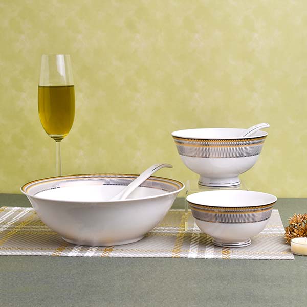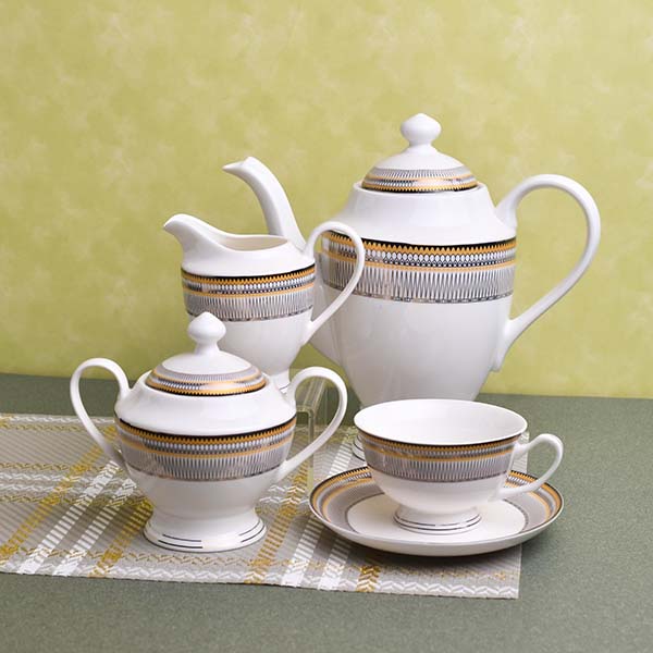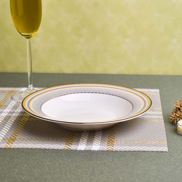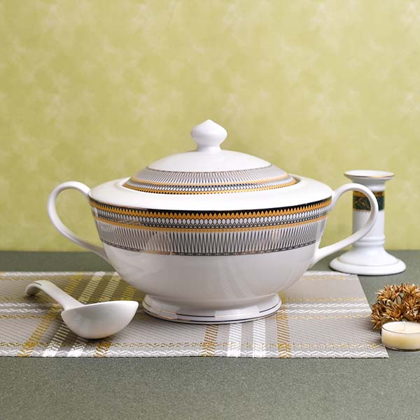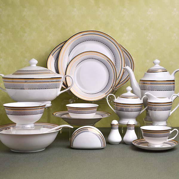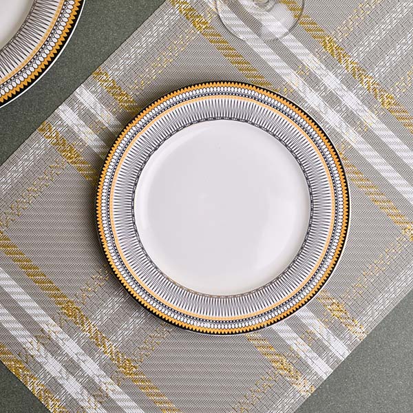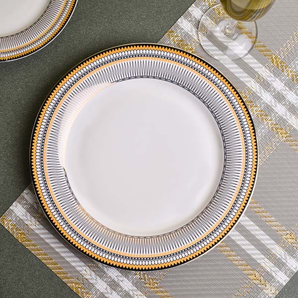 The Glance Premium 60-Piece Dinner Set in bone china, with a Black , yellow and English-inspired design, includes:
